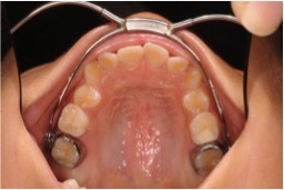 また、上あごと下あごの歯列の咬み合わせがずれていなくても、下あご歯列の前歯が上あご歯列の内側の歯肉にかみ込んでいるため、上あご前歯が前方に傾斜してしまっている場合もあります。こちらは、永久歯が生えそろってから治療を開始することが多いです。